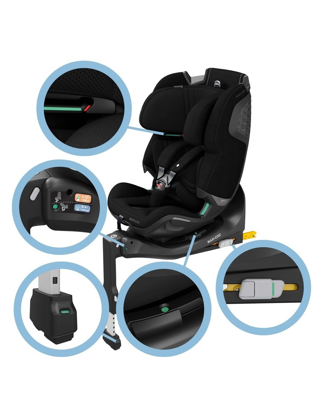Il seggiolino auto Maxi-Cosi Emerald 360 Pro con base Isofix girevole, omologato ECE R129 i-Size, è adatto a bambini da 40 a 150 cm (dalla nascita ai 12 anni).
