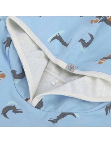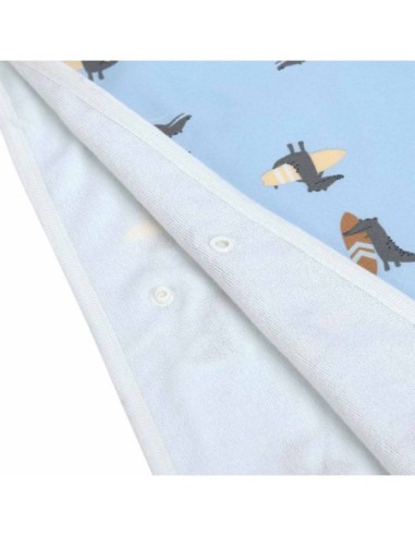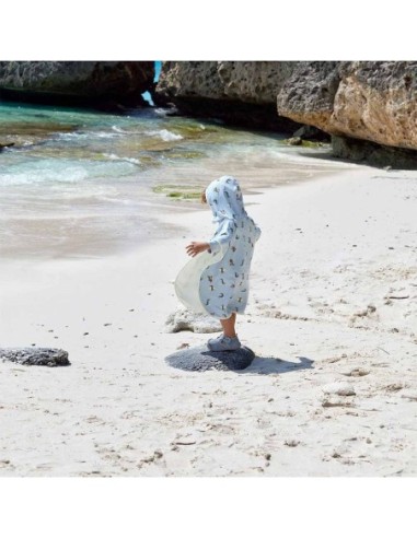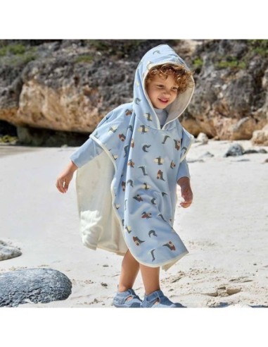 Realizzato da un lato in microfibra per non far attaccare la sabbia al corpo e dall'altro lato in spugna morbida e assorbente. Il doppio strato di tessuto permette di proteggere la pelle del tuo bambino dai raggi UV (protezione +80) e dal vento. Dotato di cappuccio e simpatiche fantasie per essere sempre alla moda.