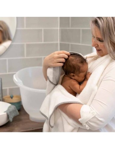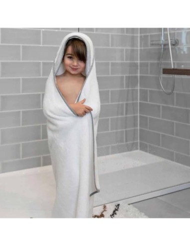 Questa grande mantella da bagno avvolge il bambino nella sua morbidezza, proteggendolo al tempo stesso dagli schizzi d'acqua.