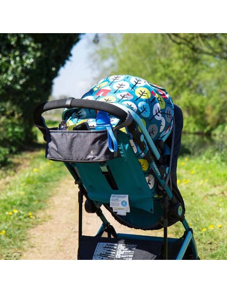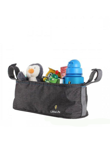Si aggancia facilmente a qualsiasi passeggino o carrozzina con cinghie e ganci e dispone di due portabevande incorporati per tazze o bottiglie, due tasche a scorrimento e una tasca in rete con cerniera.