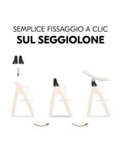Puoi agganciarlo comodamente al seggiolone per avere bavaglini, posate e giochi a portata di mano senza doverti rialzare. Il contenitore piccolo può contenere fino a 3 kg, quello grande fino a 5 kg. Entrambi sono facilmente accessibili in qualsiasi momento. Per mettere i giochi nel contenitore più grande, ti basterà spostarlo avanti e indietro una volta agganciato al seggiolone.