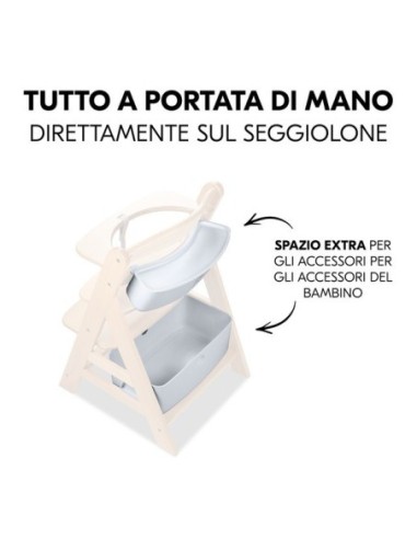 Per un equipaggiamento al top, il contenitore piccolo è combinabile, grazie al suo pratico design, con la sdraietta Alpha+ e anche con riduttore, rialzo e vassoio per seggiolone Alpha+.