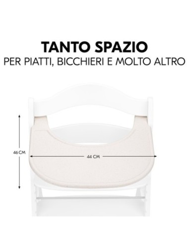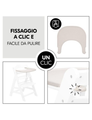Il vassoio si fissa al seggiolone con un semplice clic, offrendo al bambino dai 6 ai 36 mesi uno spazio personale. La superficie si pulisce utilizzando un panno con i comuni detergenti per la pulizia.