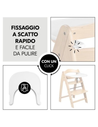 Il vassoio si fissa al seggiolone con un semplice clic, offrendo al bambino dai 6 ai 36 mesi uno spazio personale. La superficie si pulisce utilizzando un panno con i comuni detergenti per la pulizia.