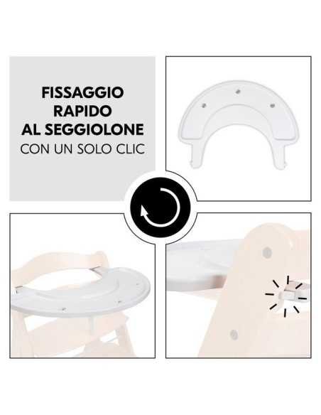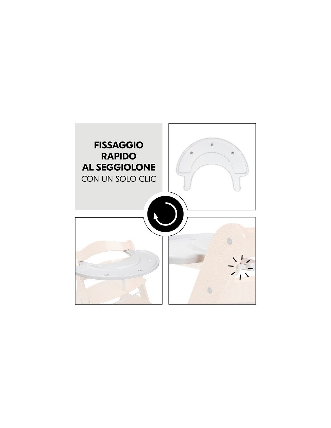 Basta un clic per agganciare Play Tray alla barra anteriore del seggiolone. È anche facile da rimuovere quando non serve più. I giochi hauck, acquistabili separatamente, possono essere fissati al vassoio Play Tray con una vite in legno. Così non rischiano di scivolare o cadere a terra mentre il bambino gioca. Play Tray può essere utilizzato con l’imbracatura a 5 punti e la cintura inguinale del seggiolone in legno Alpha+ e Beta+, così il bambino può sedere in sicurezza anche mentre gioca. A partire dai 6 mesi.