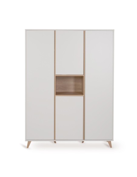 Con le sue quattro ante a battente senza maniglie, gli otto ripiani e i quattro appendiabiti, offre un ampio spazio per abiti e accessori.