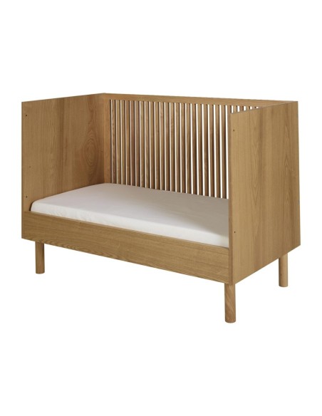 Le gambe e i fianchi con fusi sono in legno massiccio di frassino, mentre i pannelli terminali sono in MDF con rivestimento in frassino. Il letto offre due posizioni di altezza della rete a doghe per adattarsi alla crescita del bambino e può essere trasformato in un letto da giorno per bambini.