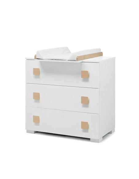 Il comò Evolution con prolunga fasciatoio, di Erbesi, unisce eleganza e praticità per offrire una valida soluzione alla gestione degli spazi e alle varie necessità del tuo piccolo. Realizzato in truciolare di prima qualità classe E1 a bassa emissione di formaldeide e rivestito in PVC, questo comò non solo garantisce un ambiente salubre per il bambino, ma si presenta anche come un complemento d'arredo di grande stile e resistenza. La struttura rinforzata e i pomelli, in legno massello di faggio, sono dettagli che parlano della cura e della qualità impiegate nella realizzazione di questo mobile.