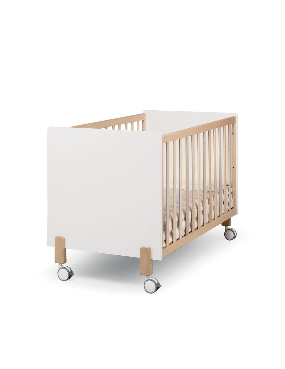 Il lettino della collezione Little di Erbesi è dotato di due posizioni della rete,Grazie a poche e facili modifiche, togliendo le ruote e una delle due sponde fisse, si può trasformare in lettino montessoriano.