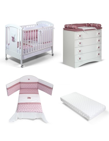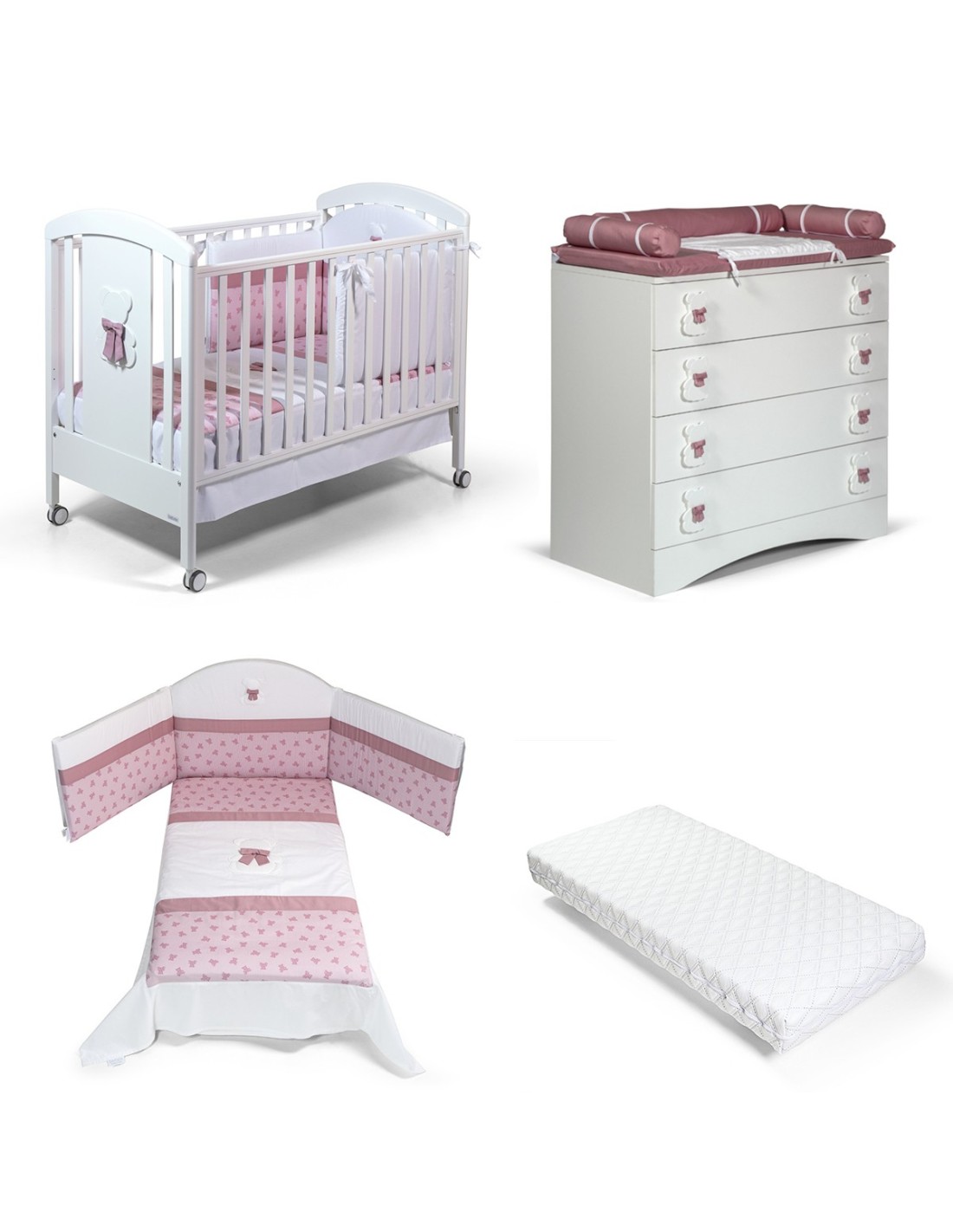 Kit di Bebex per la cameretta Dodò che comprende il lettino, il comò, il piumone e il materasso.