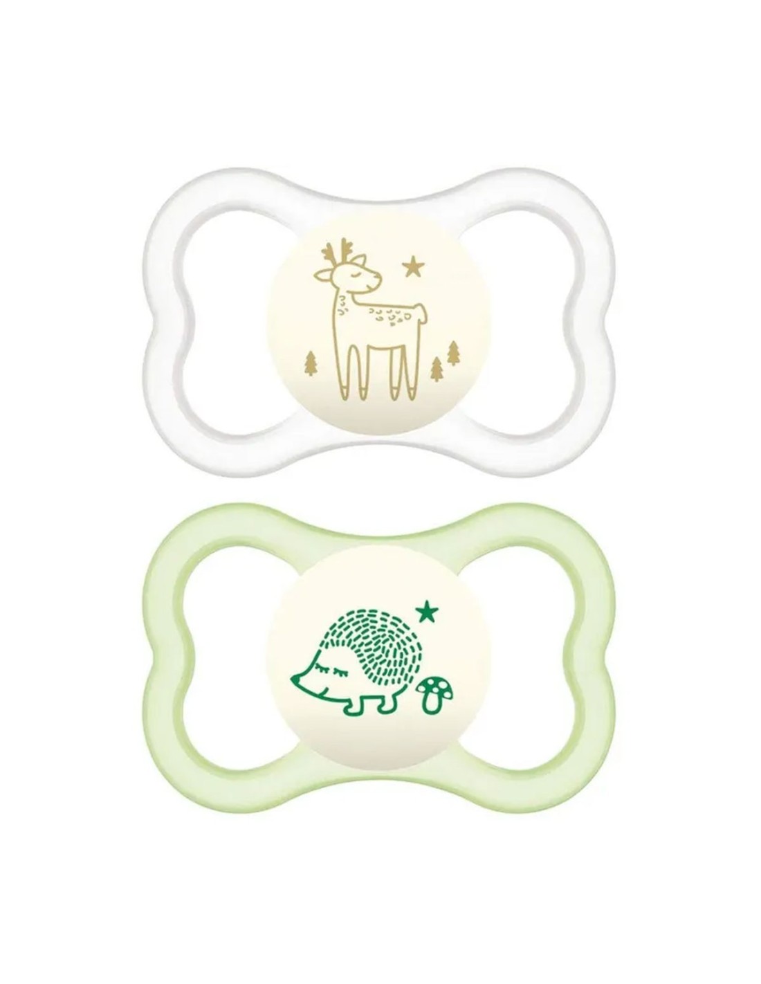 Ciuccio morbido grazie al design innovativo e al bottone che si illumina al buio il set da 2 ciucci mam air night è la componente perfetta per ogni kit di accessori dedicati ai più piccoli.