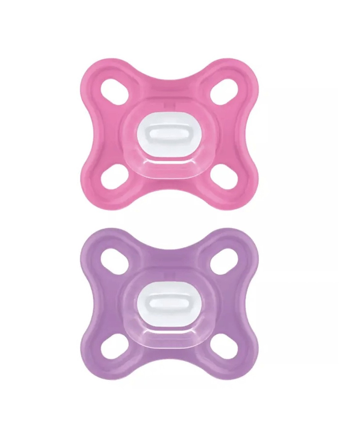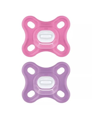 Mam Comfort 0-2 Mesi Silicone Confezione Doppia Femmina è un set di 2 ciucci in silicone per neonati dalla nascita fino ai 2 mesi di età