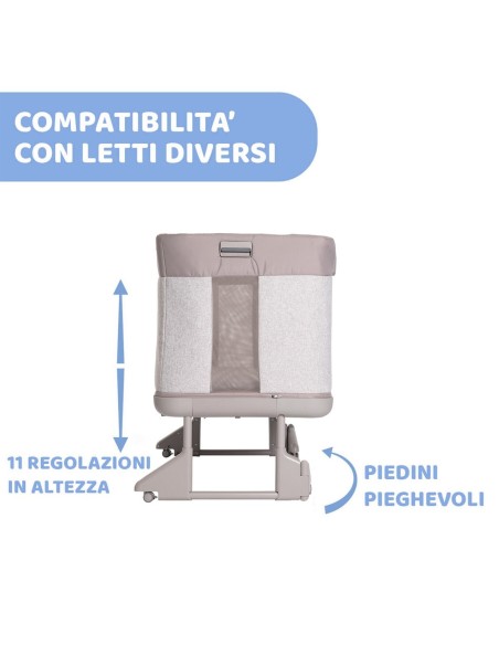 Chicco Next2Me Forever può essere installato a diversi tipi di letto. Le 11 regolazioni in altezza consentono il giusto allineamento tra barrierina e materasso dei genitori e i piedini pieghevoli permettono di usarlo anche con letti a cassettone.