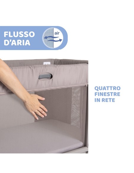 Le 4 finestre in rete ottimizzano il passaggio dell'aria, così da assicurare al bambino un ambiente fresco e ventilato.