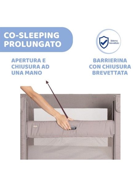 Chicco Next2Me Forever è molto più di una culla tradizionale. Grazie alle dimensioni maggiori e al meccanismo di apertura e chiusura della barrierina a scorrimento, puoi utilizzarla di fianco al tuo letto anche oltre i 6 mesi.