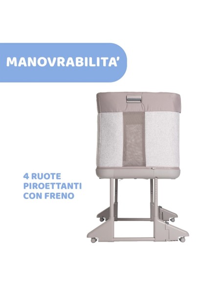 Il lettino è dotato di 4 ruote piroettanti con freni così lo potrai spostare facilmente in giro per la casa.