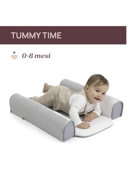 Per il tummy time (0-8 mesi): perfetto per il gioco a pancia in giù, le coccole e gli esercizi che stimolano lo sviluppo cognitivo e motorio.