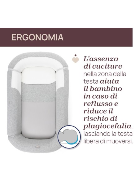 Design ergonomico: la testa resta libera di muoversi, utile nei casi di reflusso e per ridurre il rischio di plagiocefalia.