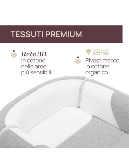 Rete 3D in cotone posizionata nelle aree più sensibili per prevenire il surriscaldamento e offrire al bambino un ambiente di sonno fresco e confortevole.