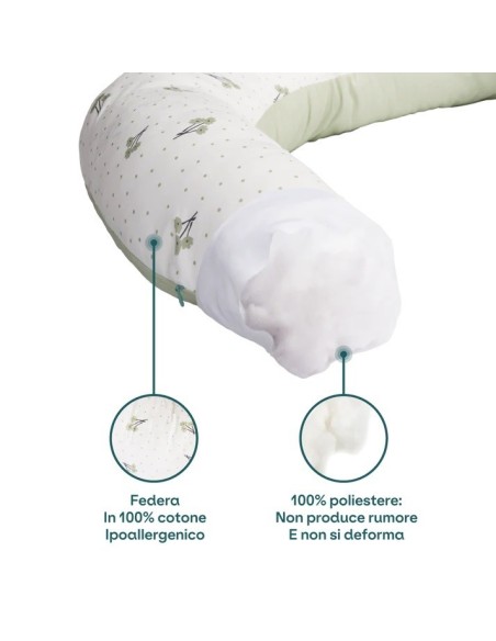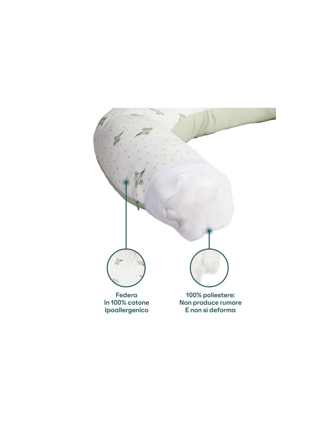 Comodo, avvolgente, e con la federa in 100% morbido cotone, ti aiuterà a dormire bene, a sostenere il peso del pancione e ad alleviare i dolori alla schiena da seduta e da sdraiata