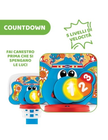 MODALITÀ CONTO ALLA ROVESCIA: Per mettersi alla prova e realizzare il maggior numero di canestri durante il conto alla rovescia dell'elefante; con 5 livelli di difficoltà progressivi