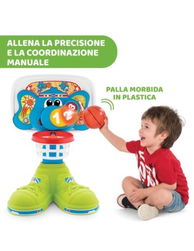 LUCI E SUONI: Il sensore riconosce il passaggio della palla e conta i punti con feedback musicali e luminosi; il canestro festeggia ogni vittoria del bambino con veri cori da stadio