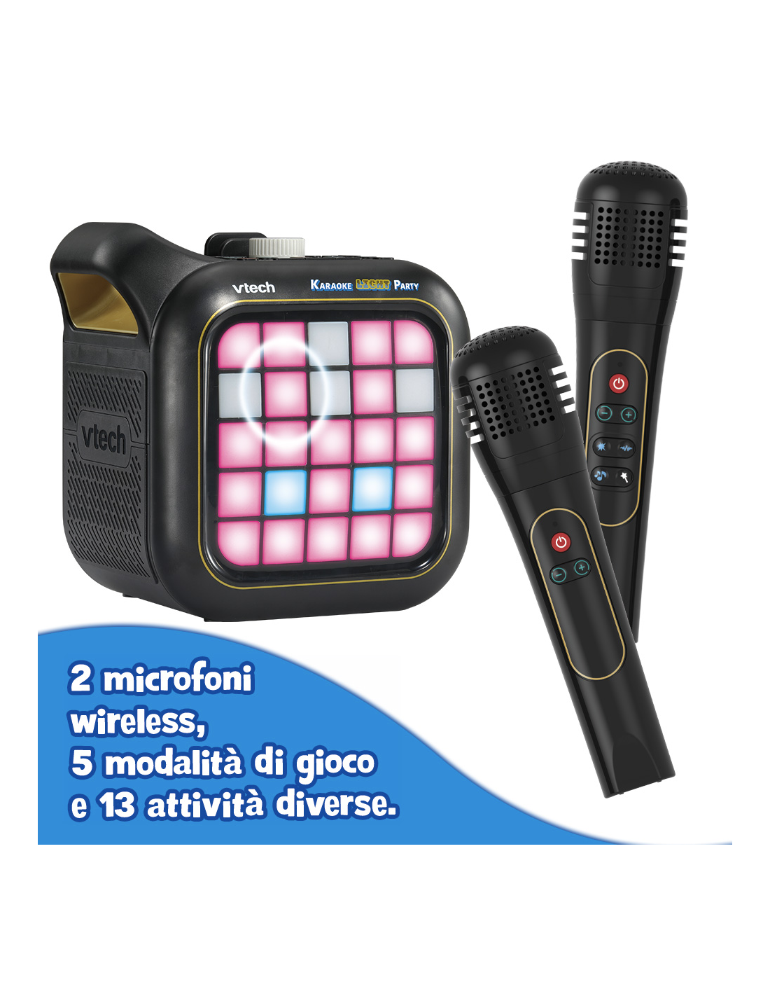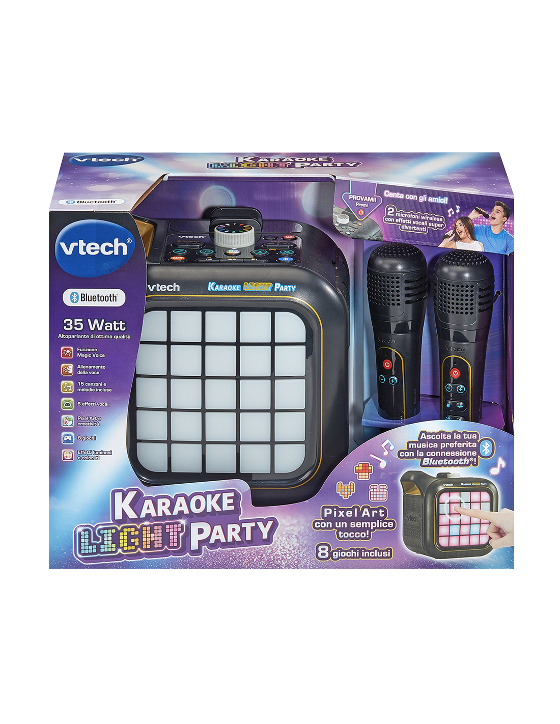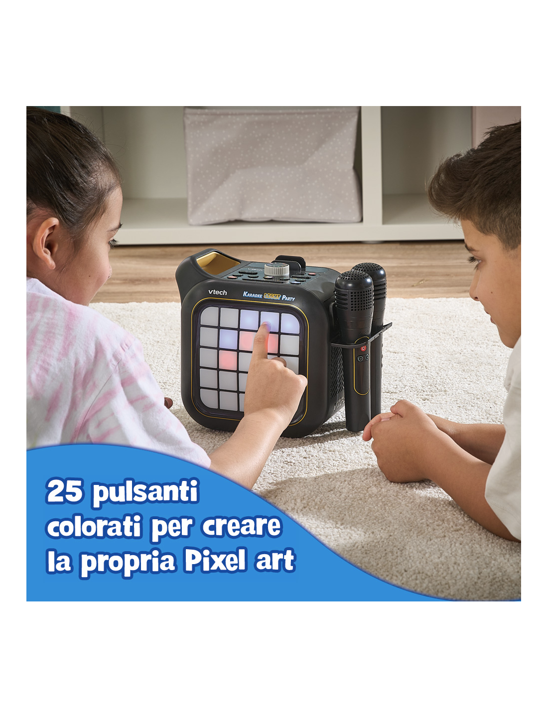 Dotato di 2 microfoni wireless, oltre 15 canzoni e melodie integrate, 6 effetti vocali, connessione Bluetooth®, luci animate e persino uno spazio creativo Pixel Art luminoso.