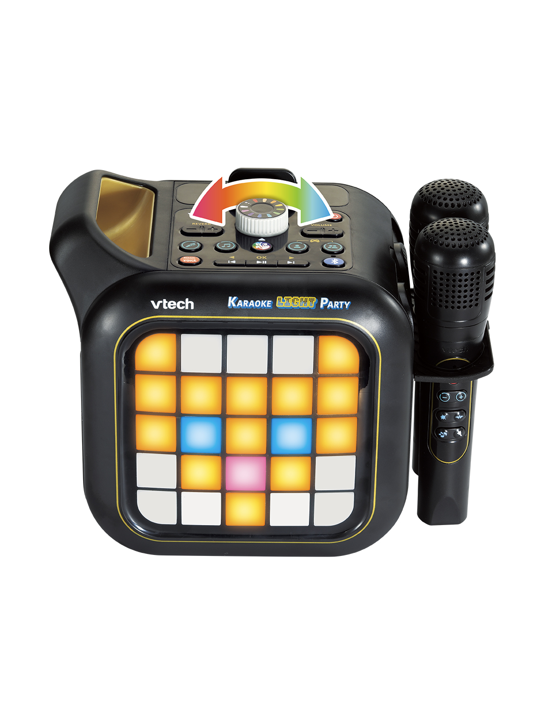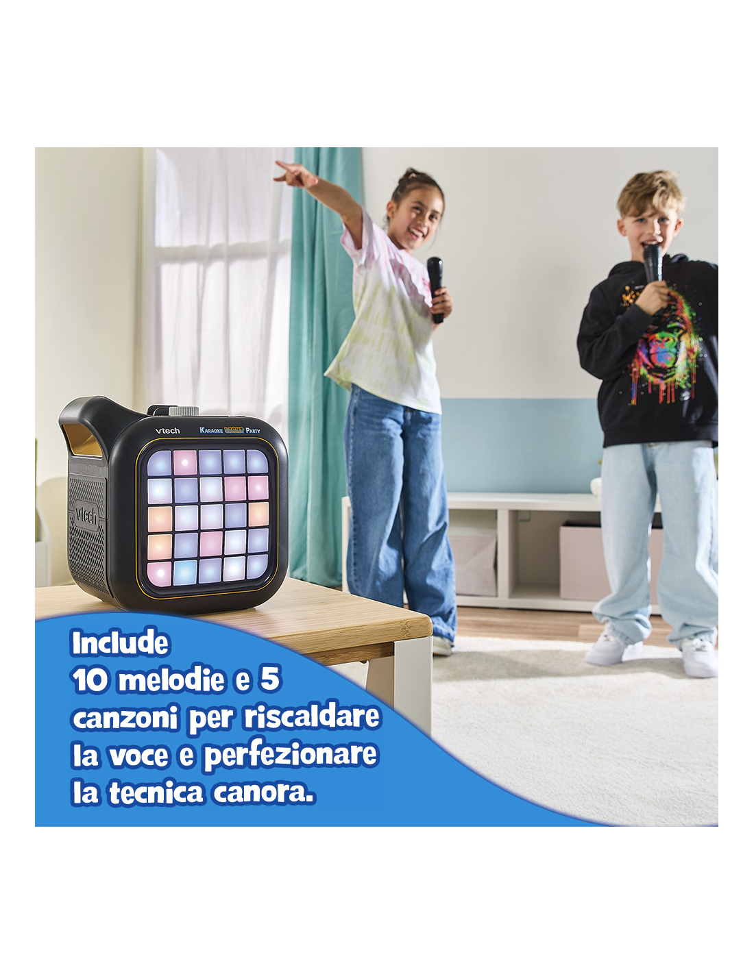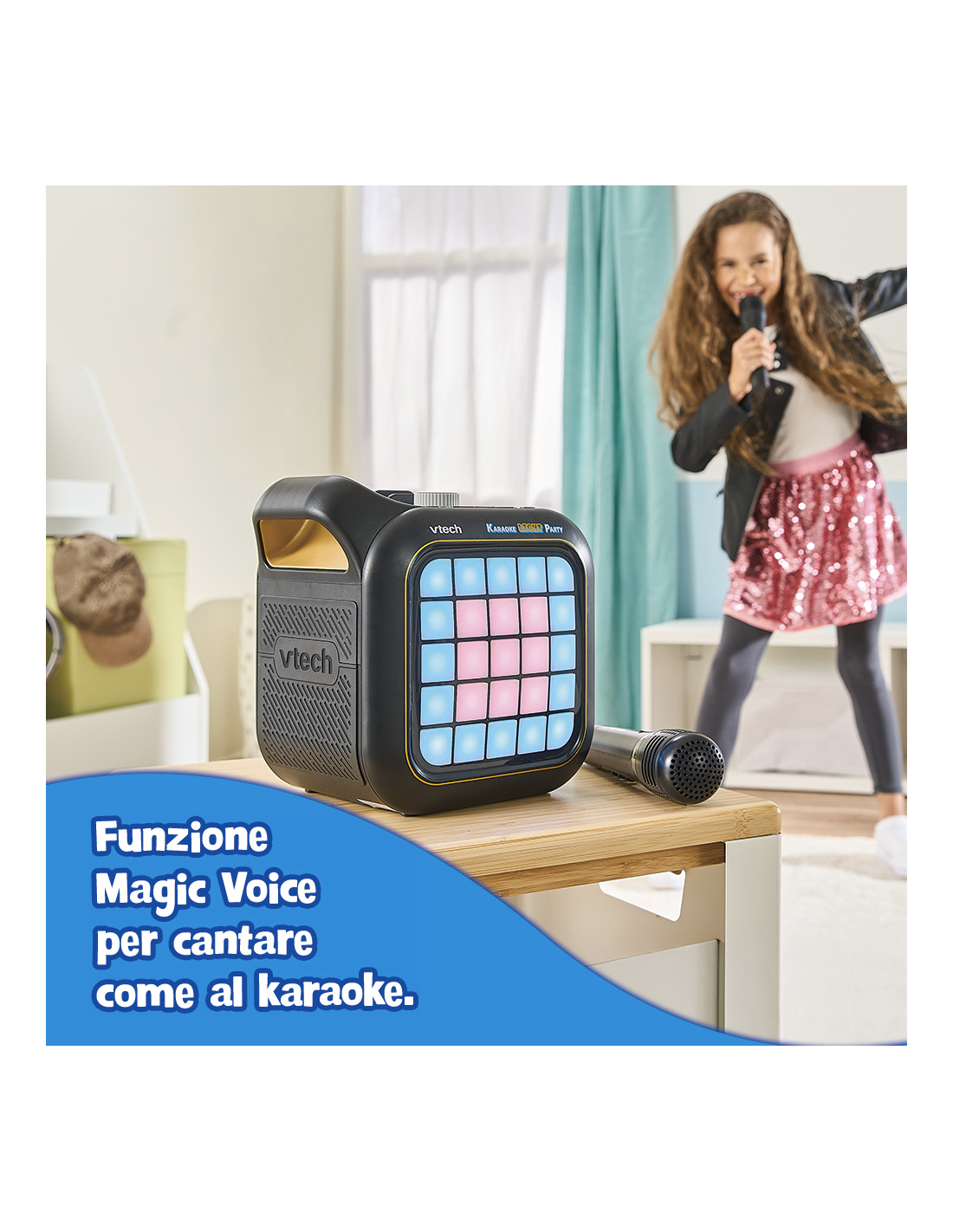 Dotato di 2 microfoni wireless, oltre 15 canzoni e melodie integrate, 6 effetti vocali, connessione Bluetooth®, luci animate e persino uno spazio creativo Pixel Art luminoso.