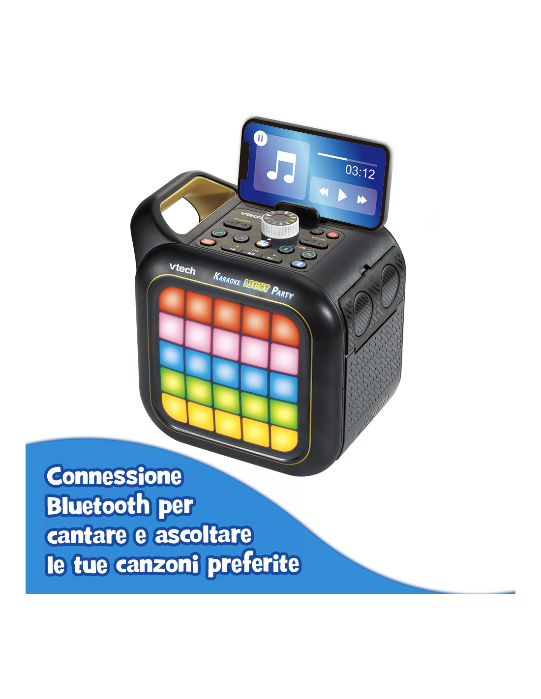Con Karaoke Light Party puoi cantare sulle musiche incluse o sui tuoi brani preferiti via Bluetooth®, animare i tasti luminosi, giocare a 8 giochi da soli o in coppia, modificare la voce in tempo reale e personalizzare l’atmosfera con diversi effetti luminosi.