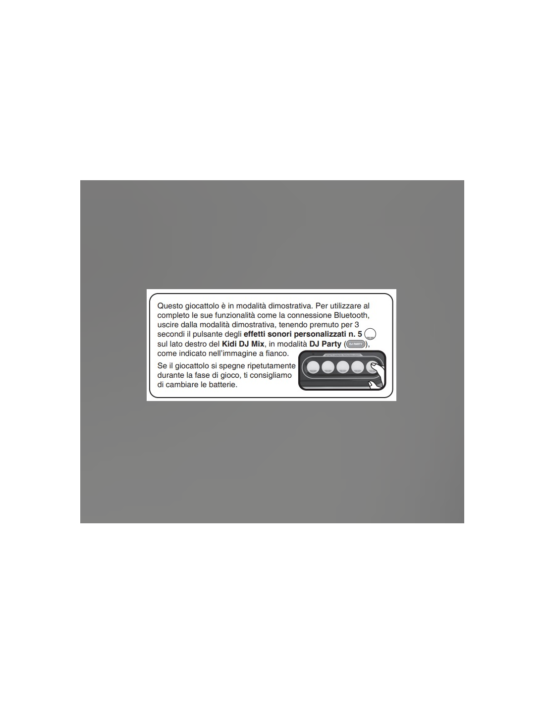 Modalità Demo: Kidi DJ Mix è in modalità Demo all'interno della sua confezione. Per uscire dalla modalità Demo premere il pulsante degli effetti sonori con il numero 5 per 3 secondi, in modalità DJ. Se l'articolo si spegne ripetutamente durante l'utilizzo, consigliamo di cambiare le batterie.