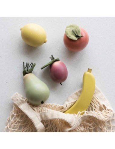 I cinque frutti - una banana, una mela, una pera, un limone e una prugna - sono confezionati in un sacchetto di spago all'uncinetto di ispirazione francese. I frutti sono realizzati in legno di faggio e presentano deliziosi dettagli in tessuto e filato.