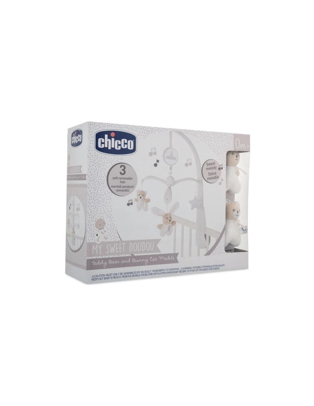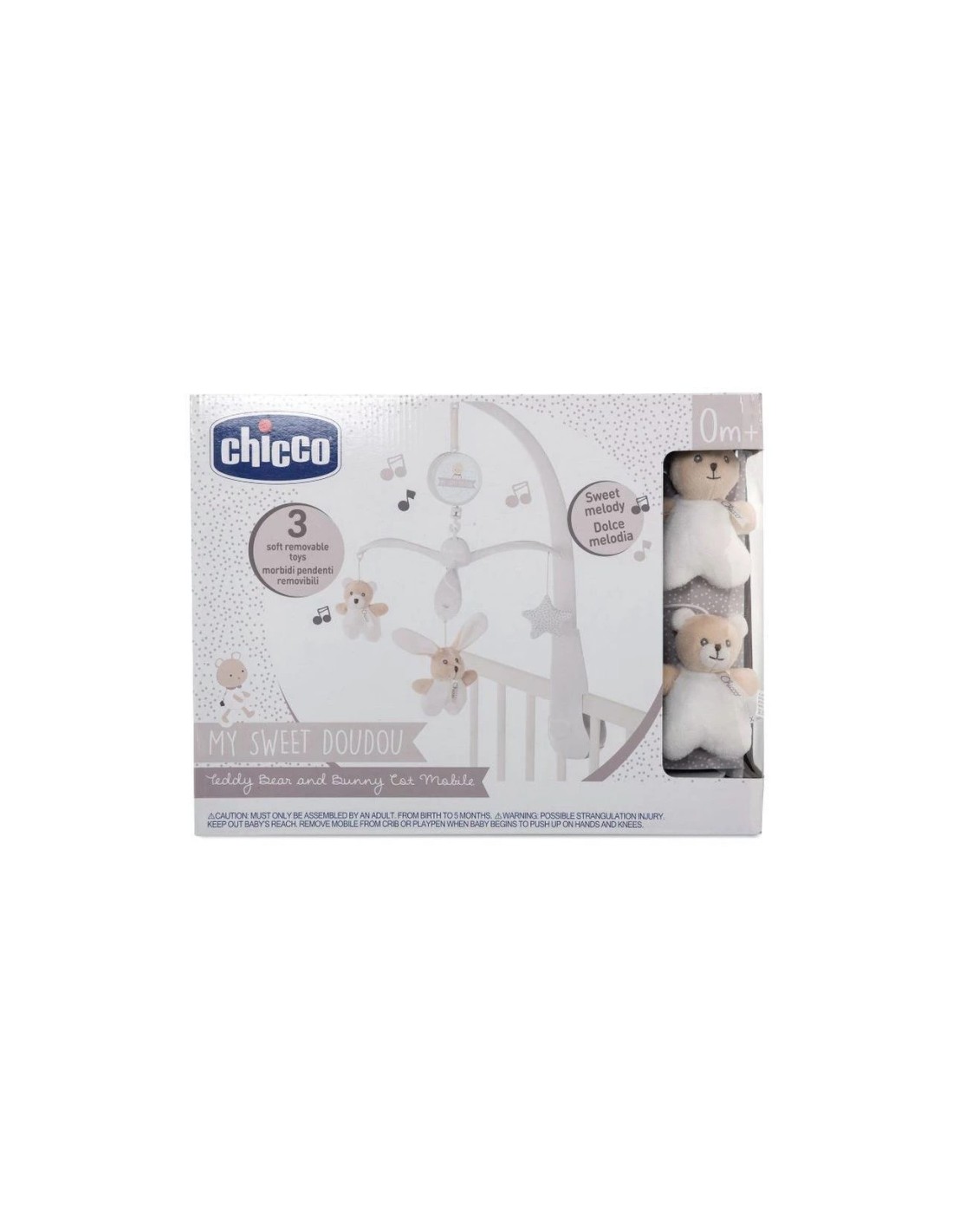 La Giostrina Chicco My Sweet Doudou è composta da una scatola musicale che suona una dolce melodia e tre dolci peluche sospesi.