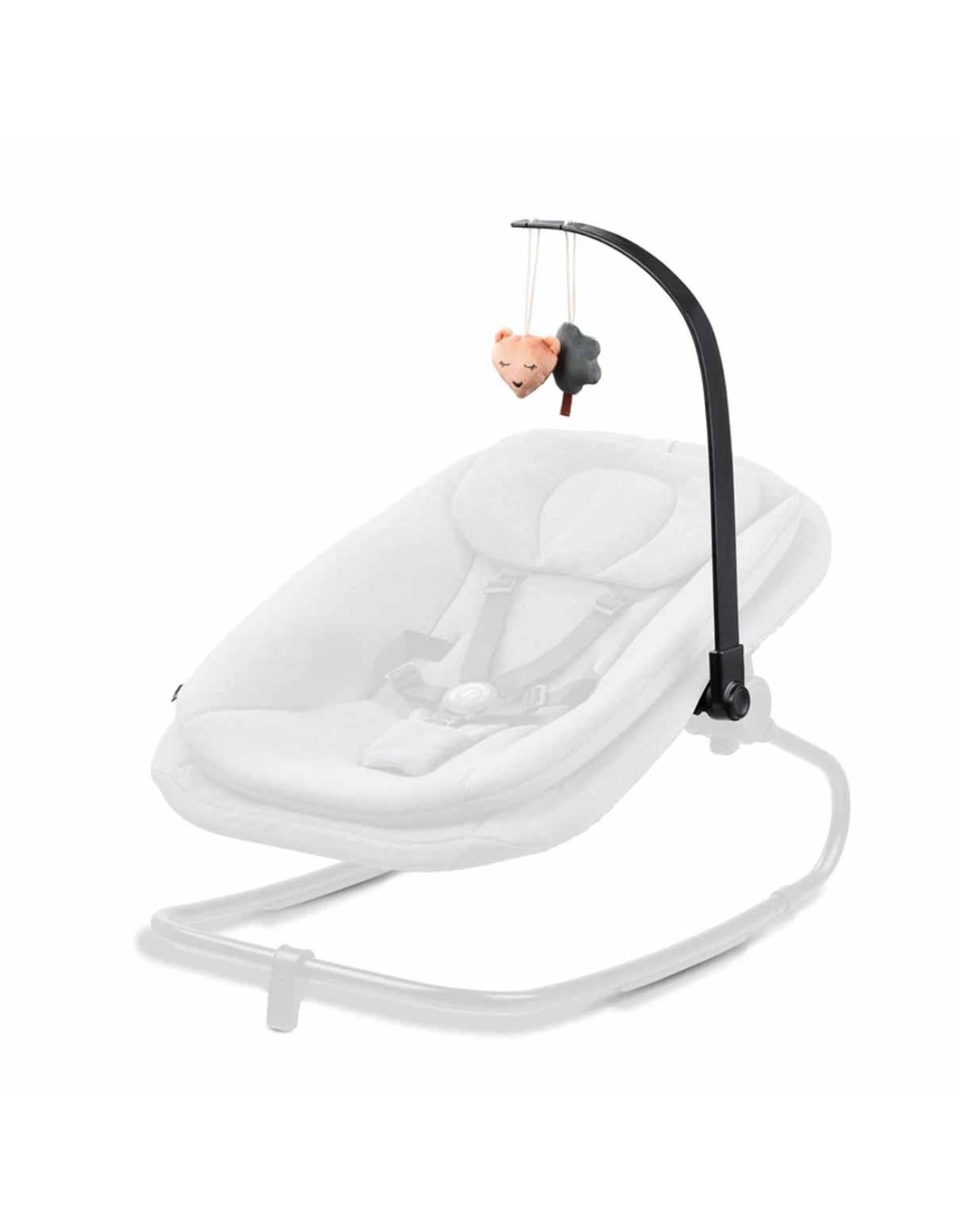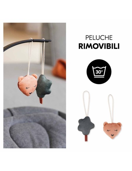 Hai bisogno di togliere l'arco giochi per un po'? Nessun problema! Puoi facilmente rimuovere l'arco e lasciare l'unità di fissaggio montata sulla sdraietta Highchair Bouncer. Anche i peluche sono fissati solo sull'arco giochi e possono essere rimossi per essere lavati.