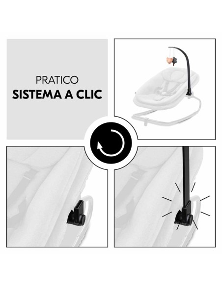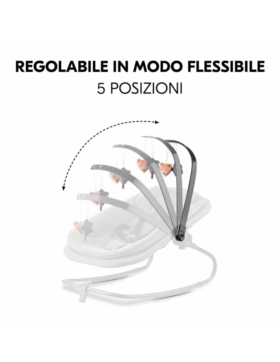 Puoi fissare facilmente l'arco giochi su entrambi i lati della sdraietta Highchair Bouncer, senza bisogno di attrezzi. E altrettanto facilmente puoi rimuoverlo quando non è necessario. Grazie alle 5 diverse posizioni, l'arco giochi si adatta in modo flessibile. Basta ruotarlo e gli animaletti saranno più vicini o più lontani. Inoltre, puoi posizionare il bambino nella sdraietta più facilmente.
