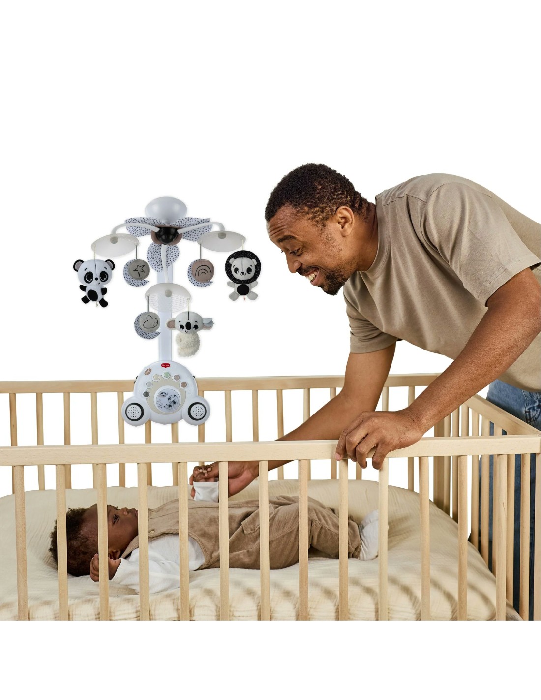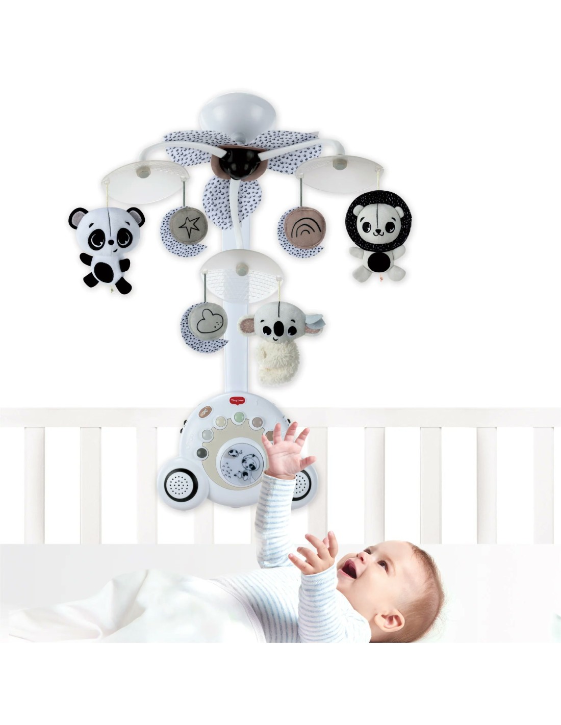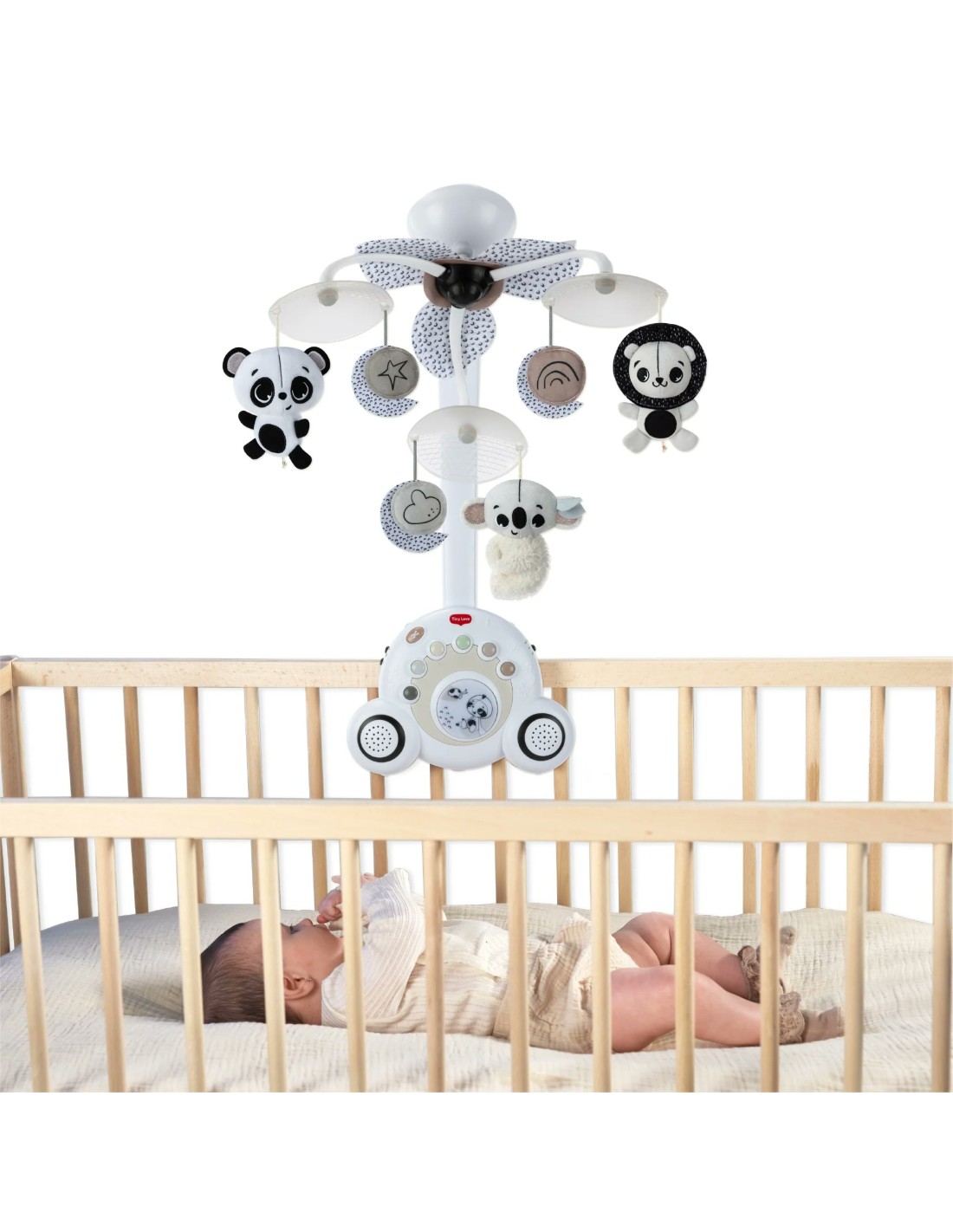 Giostrina musicale bianco e nero progettata per calmare e favorire lo sviluppo precoce. Cresce con il tuo bambino: si trasforma da mobile a carillon autonomo.