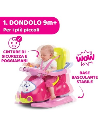 - DONDOLO: É la modalità adatta ai bambini piccoli (a partire dai 9 mesi) grazie alle stabili basi basculanti, ai poggia braccia protettivi, alle cinture di sicurezza e allo schienale avvolgente