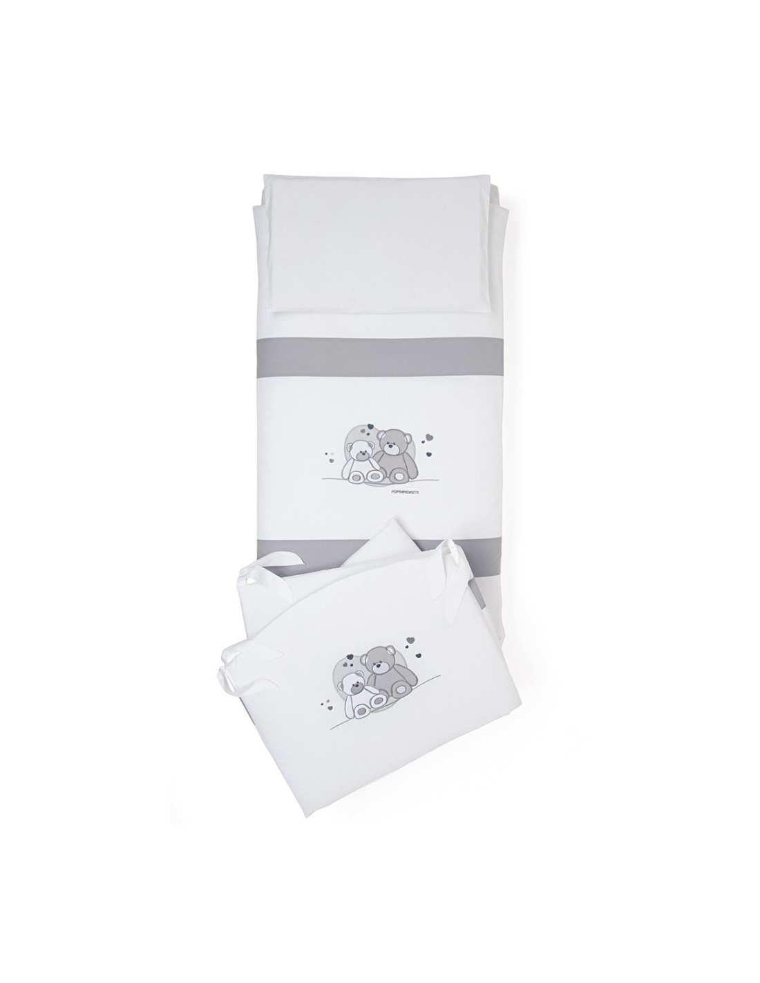 Il completo piumone Golosone di Foppapedretti è caratterizzato da ricami con un orsetto goloso e due simpatiche apine, nelle tinte del beige. Il set tessile è composto da paracolpi con imbottitura in poliestere 100% e rivestimento in cotone 100%, sacco sfoderabile in cotone 100% e imbottitura in poliestere 100% e federa per cuscino in cotone 100%.