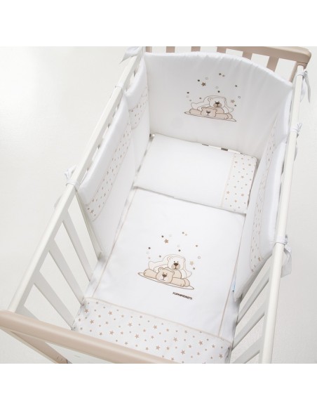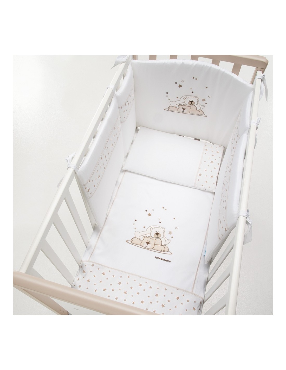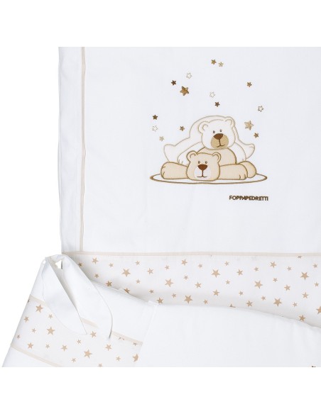 Il completo piumone Pikkoletto Dolcestella bianco di Foppapedretti è caratterizzato da ricami con due teneri orsetti e tante stelline, nelle tinte del grigio. Il set tessile è composto da paracolpi con imbottitura in poliestere 100% e rivestimento in cotone 100%, sacco sfoderabile in cotone 100% e imbottitura in poliestere 100% e federa per cuscino in cotone 100%.