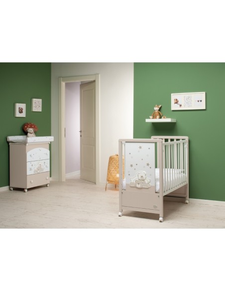 Il lettino in legno Pikkoletto Dolcestella bianco di Foppapedretti ha le dimensioni di una spaziosa culla, ideale per far dormire il bambino insieme a mamma e papà, e ha una testata con pannello decorato con i motivi dell’iconica collezione Dolcestella: due teneri orsacchiotti e tante stelline.