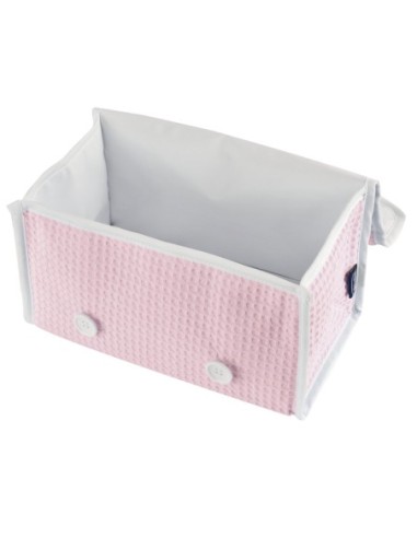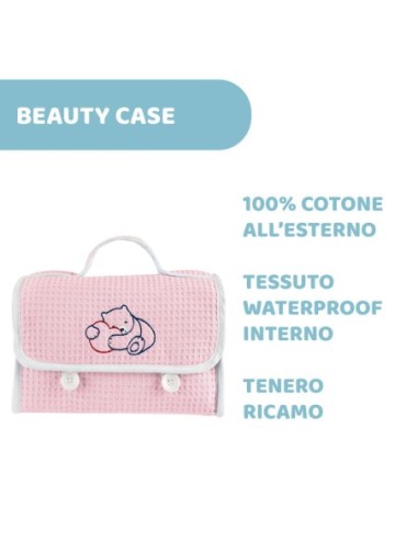 Prezioso beauty case in cotone disponibile in azzurro o rosa, realizzato in cotone all'esterno e con tessuto impermeabile all'interno.