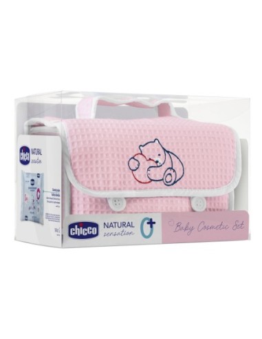 Prezioso beauty case in cotone disponibile in azzurro o rosa, realizzato in cotone all'esterno e con tessuto impermeabile all'interno.