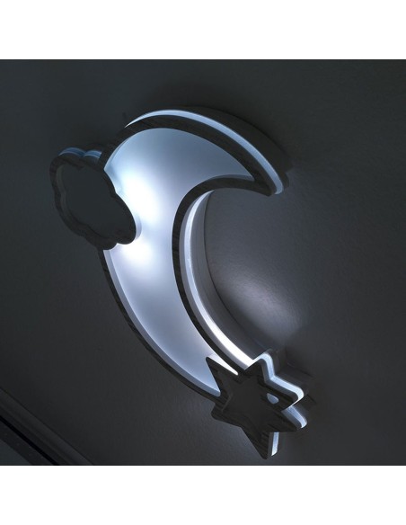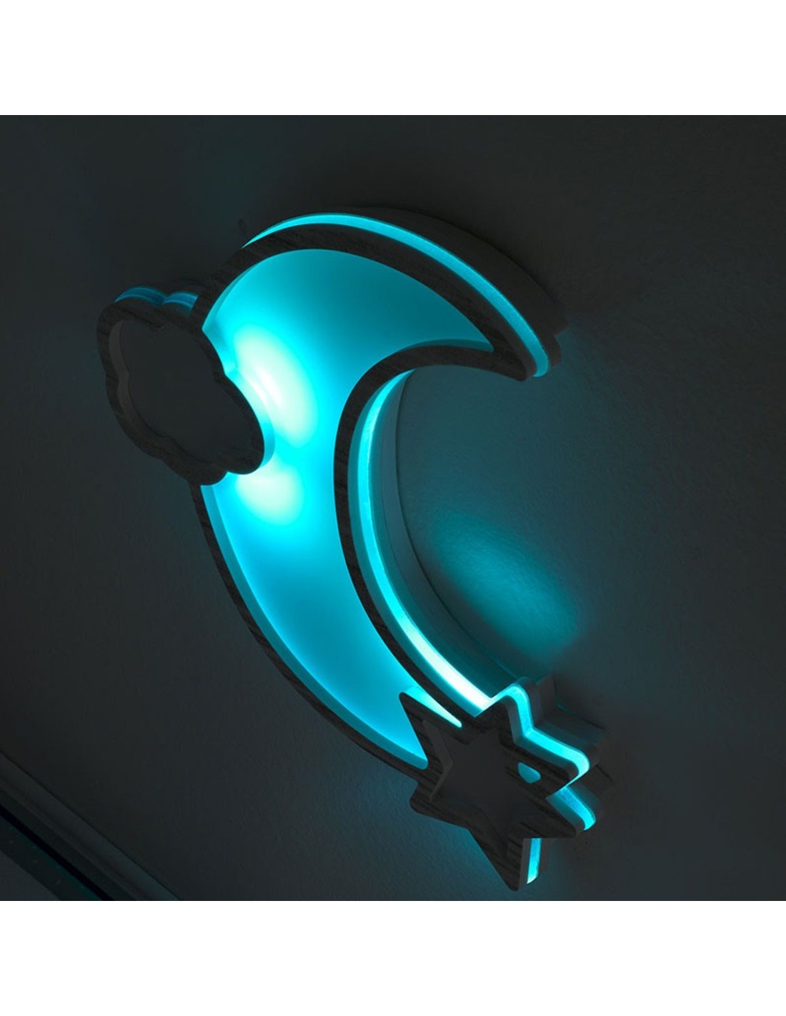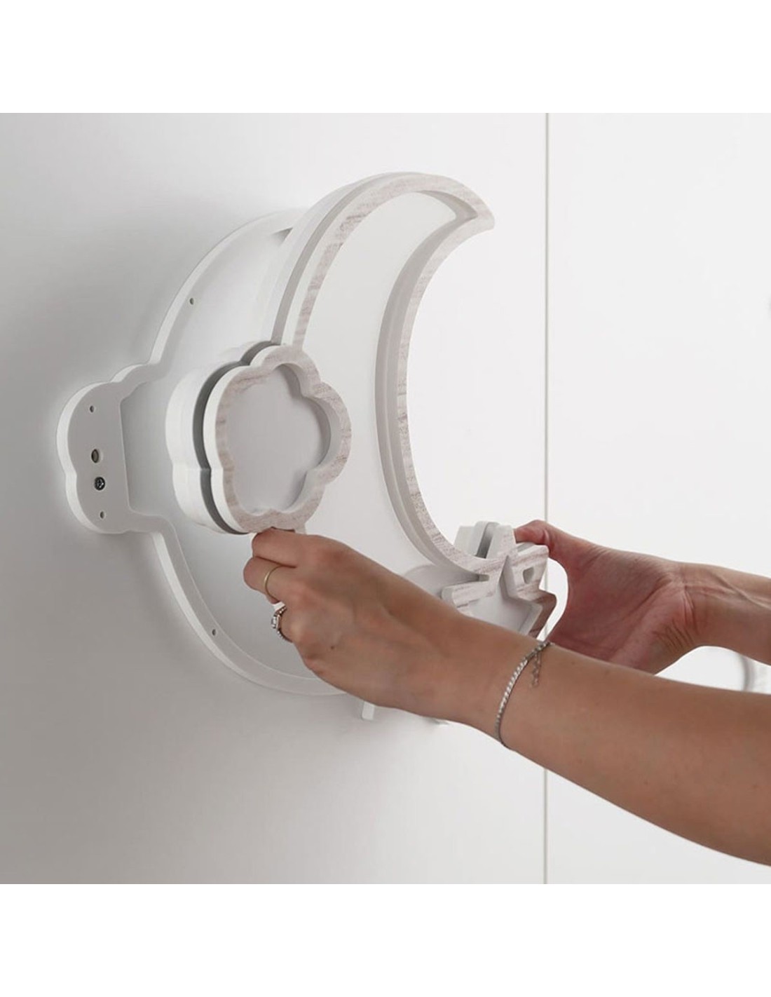 Erbesi Lampada a Muro Moon con 8 Luci Led di Erbesi è una graziosa e caratteristica decorazione che si illumina al buio! É integrata di luci led e si fissa tramite magneti all'armadio, perfetta da abbinare all'Armadio Moon Erbesi. La Lampada a Muro Moon cambia colore tramite l'apposito telecomando, nella versione Wifi invece viene controllata con lo smartphone. La Lampada a forma di Luna Erbesi dispone di otto colori (bianco, giallo, arancione, rosso, viola, azzurro, blu e verde) ispirati al principio della cromoterapia, ossia che le varie lunghezze d'onda dei colori corrispondono a precise vibrazioni capaci di influenzare lo stato d'animo.