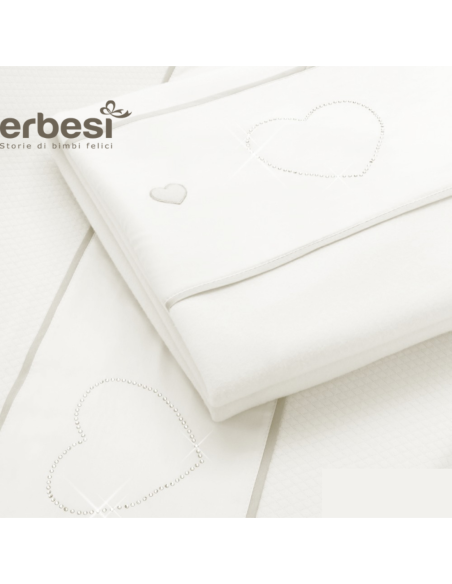 Il Set Lenzuolino Erbesi 3 pezzi per Lettino è un graziosissimo e morbidissimo set tessile composto da federina, lenzuolino sotto e lenzuolino sopra.