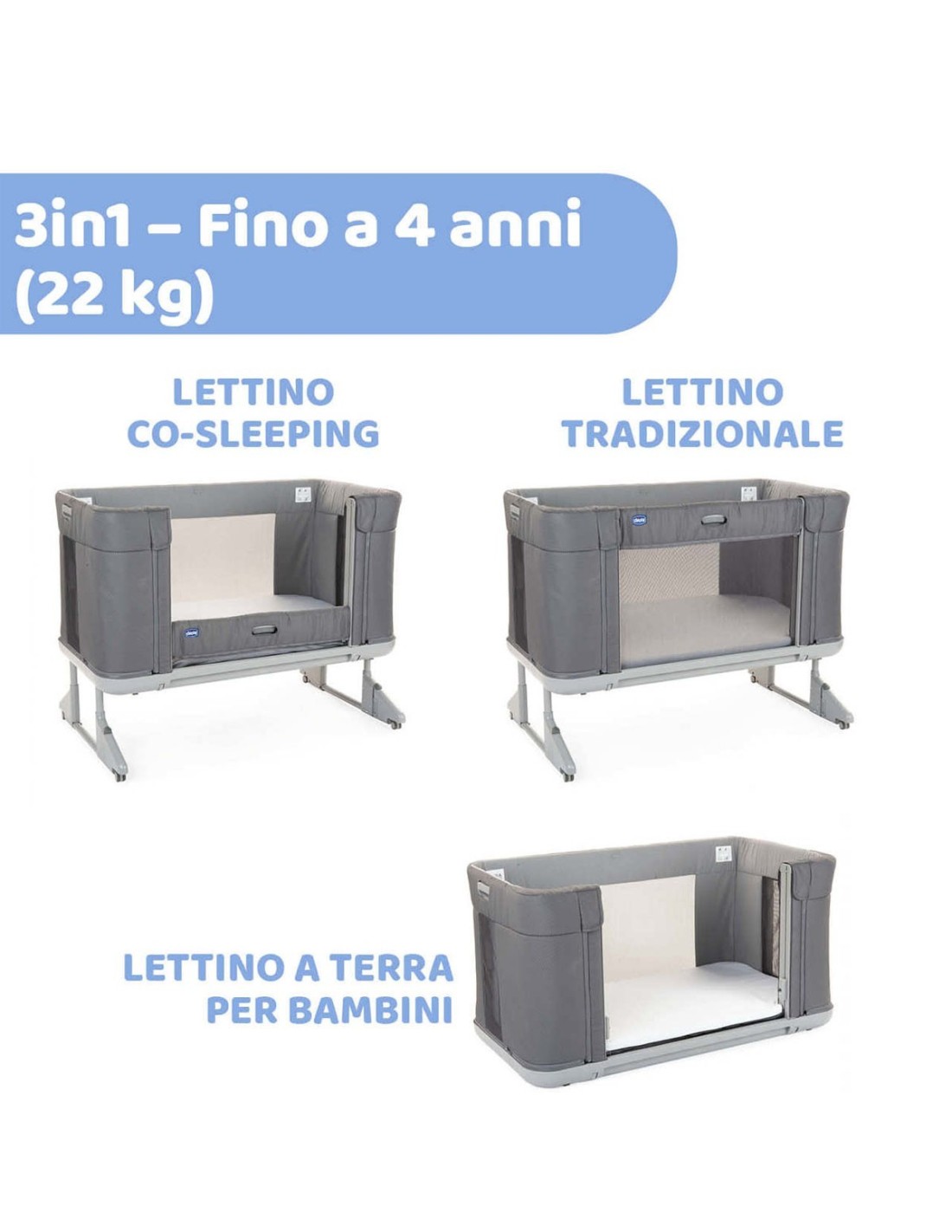 Una soluzione unica dalla nascita fino a 4 anni con 3 diverse funzionalità : lettino co-sleeping, lettino tradizionale e letto a pavimento.