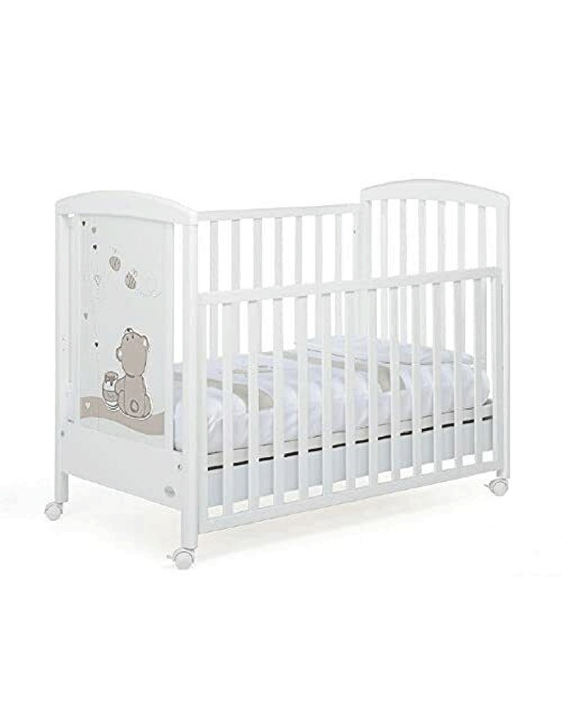 Lettino con sponda regolabile a due posizioni. Struttura in legno di faggio. Testata con pannello decorato. Rete regolabile a 2 altezze.