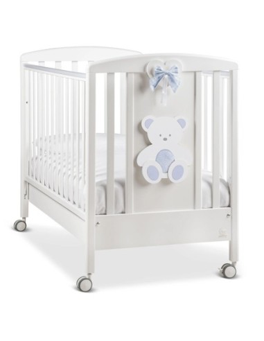 Lettino con pannello pediera largo e decorato con un dolce orsetto in rilievo che ha il pancino imbottito effetto peluche