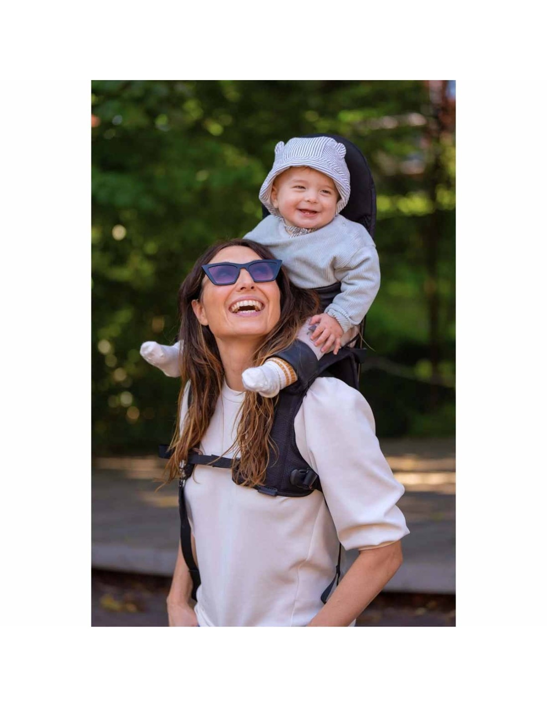 Il comfort per il genitore viene fornito posizionando il bambino su una seduta appositamente progettata, sospesa appena sopra le spalle, alleviando così collo e spalle dallo stress diretto. Per passeggiate più lunghe in tutta comodità.