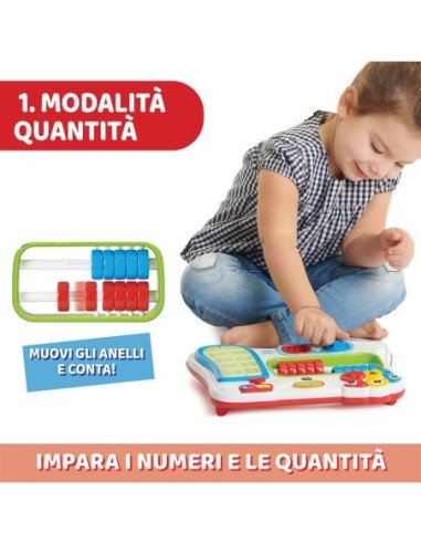MODALITÀ QUANTITÀ: Il bambino sposta gli anelli colorati a destra e impara il totale sul contatore luminoso; oppure inserisce un numero per ascoltare le rime associate