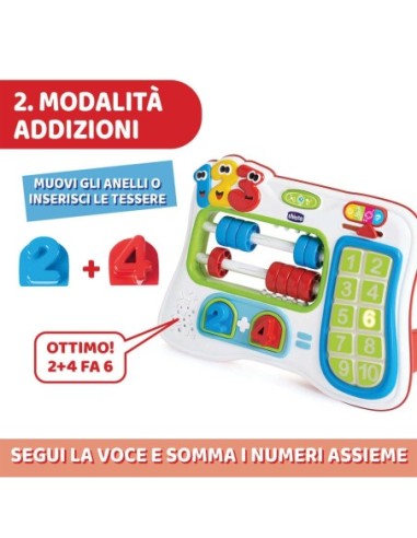 Chicco Abaco Numeri & Somme è un giocattolo matematico parlante con tre modalità di gioco crescenti; guida i bambini nell’apprendimento delle quantità, delle somme fino a rispondere ai quiz matematici