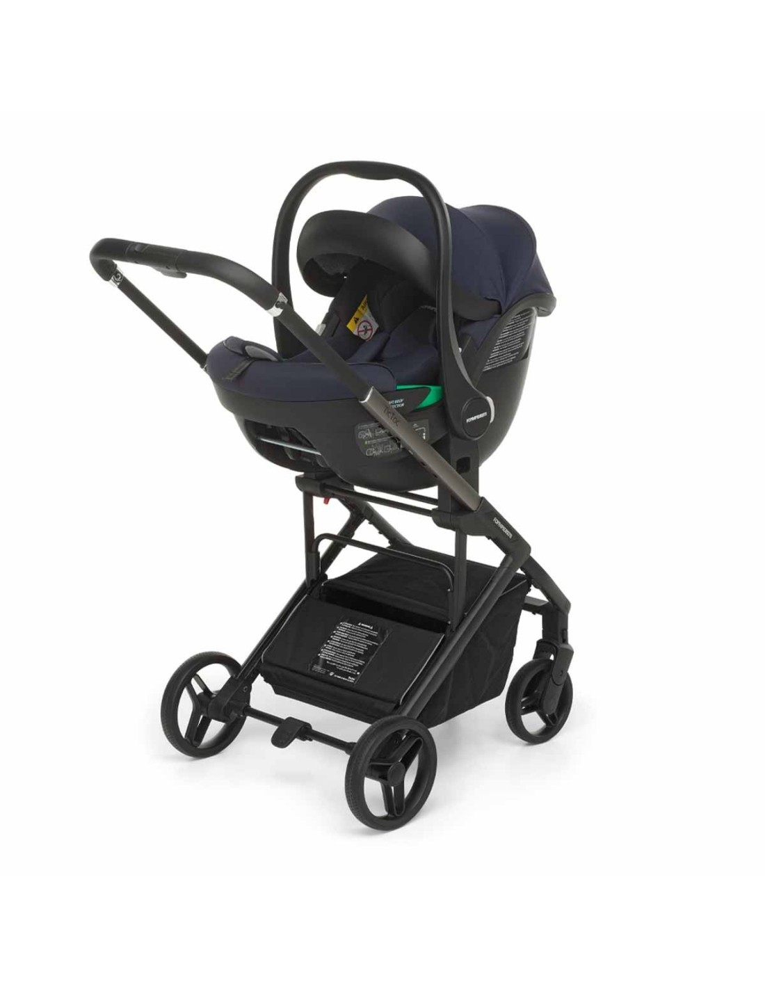 Sul leggero telaio in alluminio Self Standing con dettagli cromati possono essere montati la navicella spaziosa, interno sfoderabile e pieghevole per chiusura compatta, poi la seduta passeggino reversibile e chiudibile fronte strada e fronte mamma con schienale areato, utilizzabile fin dalla nascita, e il seggiolino auto i-Size per i primi mesi (per bambini da 40 a 87 cm di altezza, max 13 kg).